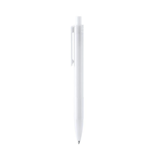 Esferográfica em ABS reciclado. Possui um clipe e botão de pressão na mesma cor do corpo.
